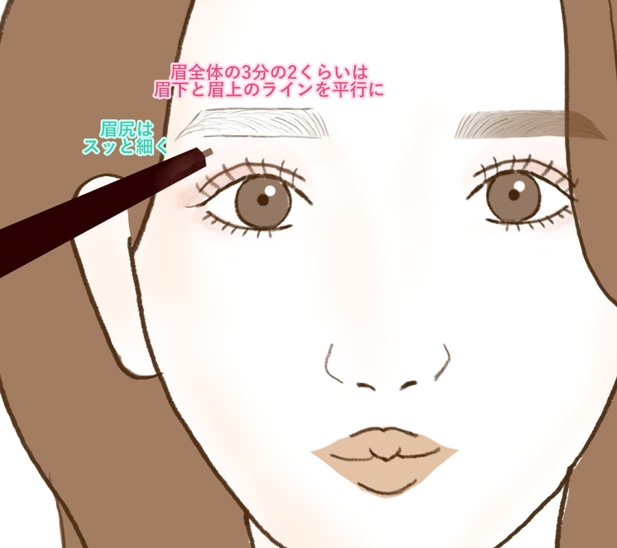眉の輪郭は直線的に描きましょう。眉全体の3分の2くらいは眉下と眉上のラインを平行に描き、眉尻側の3分1は眉上のラインを落として眉尻をスッと細く描くのがポイントです。このとき、眉尻が眉頭より下にならないよう気をつけてください。アイブロウペンシルは細めのものがおすすめです。