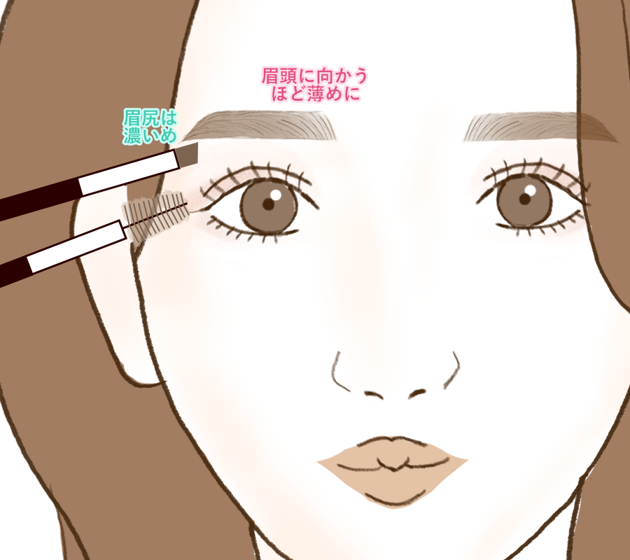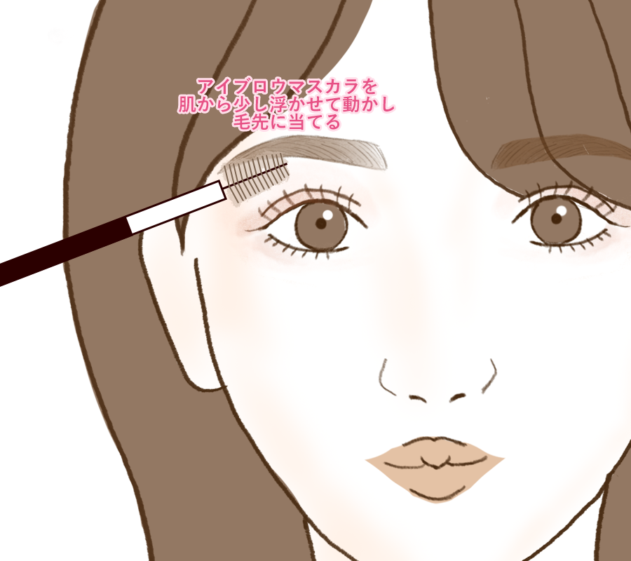 - 毛先に色をつけるイメージでアイブロウマスカラは肌から少し浮かせる