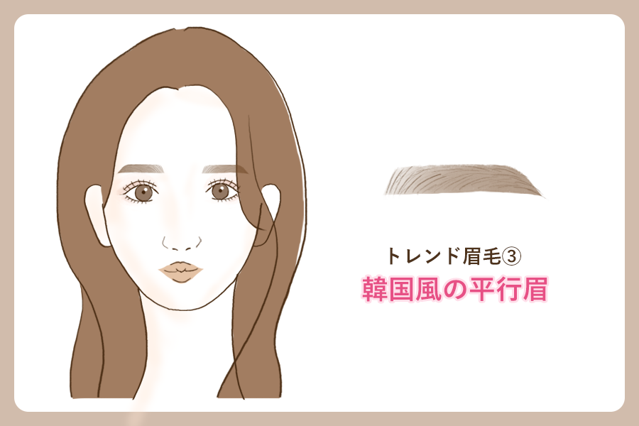 韓国風の平行眉は、以前から根強い人気があるトレンド眉です。新たに流行している淡色のアーチ眉と並んで、韓国風眉の定番となっています。元々は自眉を無視して角度をつけない平行眉が流行っていましたが、最近は眉尻に角度をつけて細く描いたものが人気です。
