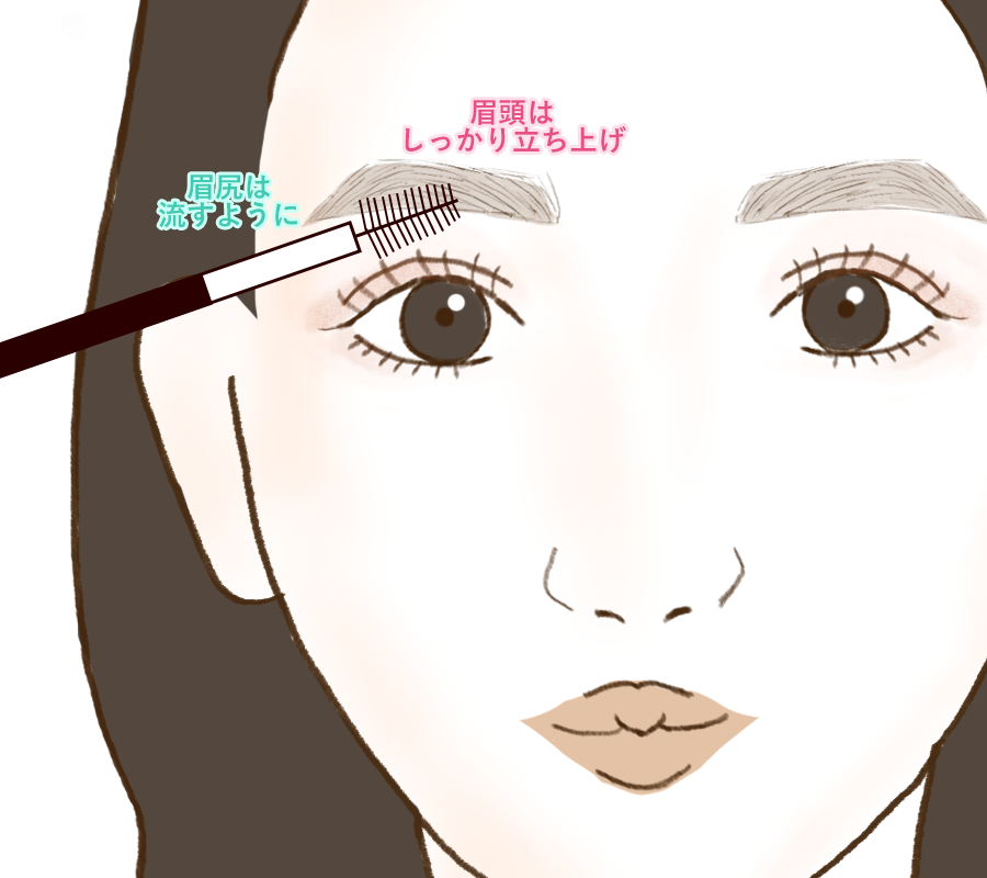 ナチュラルさを出すために、極力アイブロウパウダーは使いません。クリアなアイブロウマスカラやアイブロウジェルで眉毛を立ち上げて、毛流れを作りましょう。眉頭はしっかり立ち上げ、眉尻は流すようにするのがポイントです。