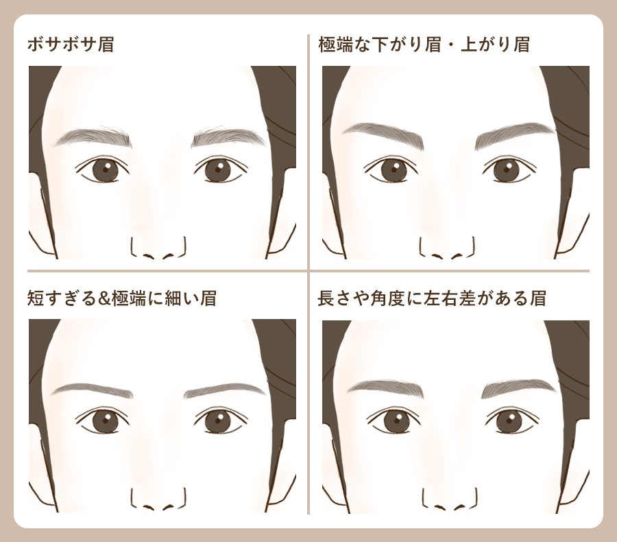 女性と比べると眉毛を整える習慣がない人が多い男性は、気づかないうちに眉毛で損をしてしまっている可能性があります。たとえば、眉が以下のような状態になっている人は要注意です。