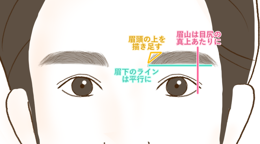 - 太さが足りないときは、目の縦幅の3分の2程度を目安に眉下を描き足す