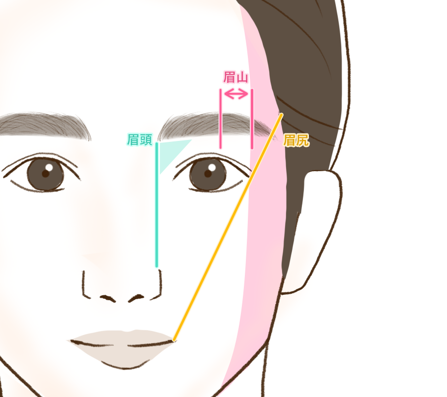 最後に眉尻は、上唇中央から目尻を繋いだ延長線上がベストな場所です。眉尻は眉頭より高くなるように整えましょう。