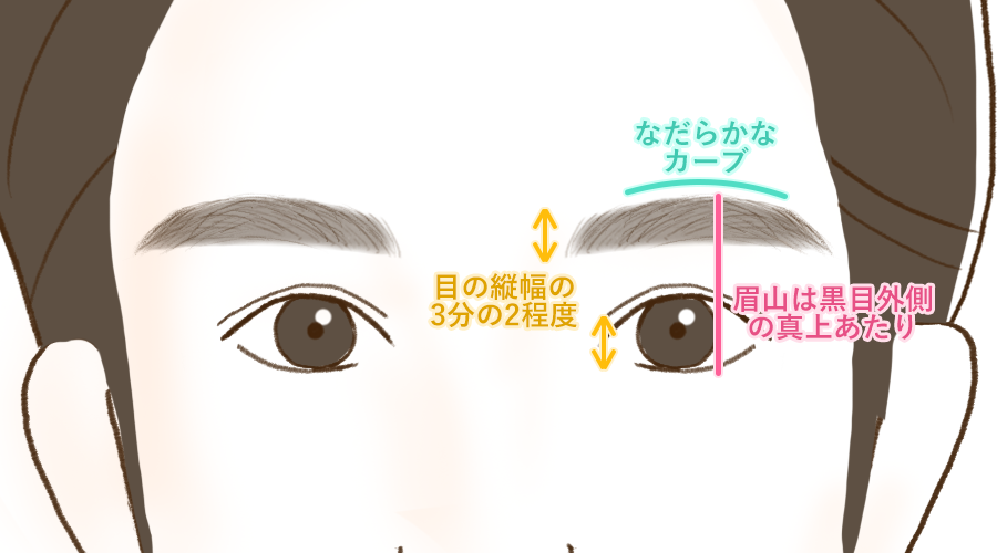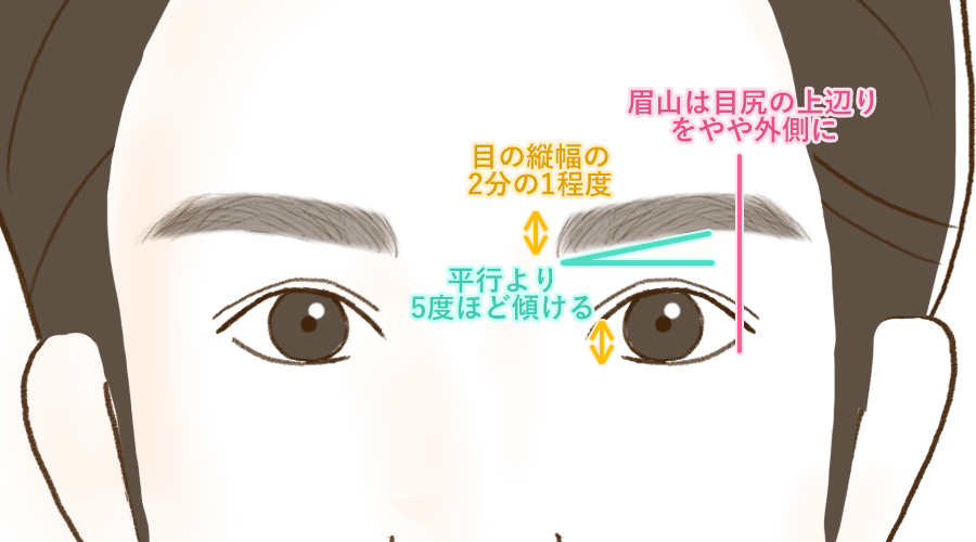 男性の眉毛の太さは、目の縦幅の2分の1〜3分の2ほどが目安です。眉頭から眉尻にかけて、だんだん細くなるように整えましょう。