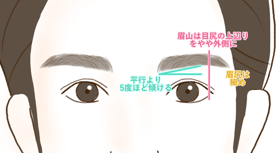 直線眉に整える場合、眉山は目尻の上辺りを目安に、一般的な眉よりやや外側に作ります。続いて、平行よりも5度ほど傾け、眉尻は少し細めに仕上げるとよいでしょう。