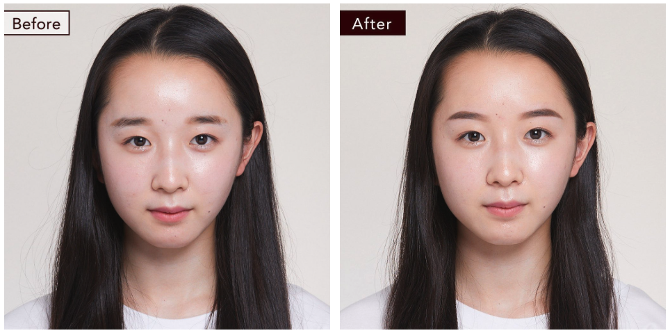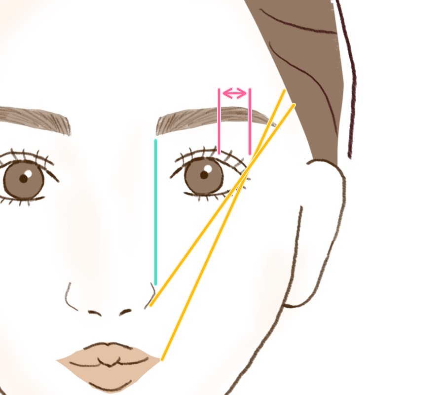 顔は、眉頭から眉山が正面として認識されます。眉頭から眉山への距離が長いとやや大きめの顔、短いとパーツが中心に集まったような顔に捉えられます。