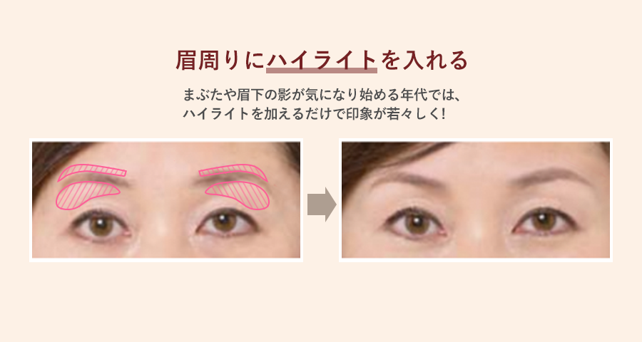 40代のアイブロウメイクアップでは、ハイライトを上手に使うことで目もと全体を明るく見せ、リフトアップ効果を演出できます。とくにまぶたや眉下の影が気になり始める年代では、ハイライトを加えるだけで印象が若々しくなります。