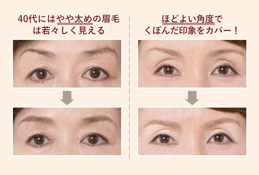 40代の方は、とくに眉頭から眉山にかけての角度がなだらかになるように注意してください。角度をつけすぎるときつい印象を与えてしまう場合があります。また、眉尻が下がっている場合は、眉頭より高い位置にくるよう調整しましょう。