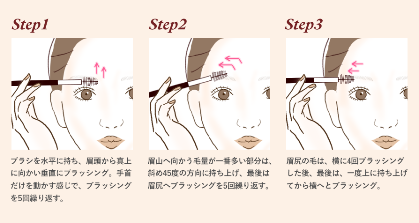 まず、ブラシを水平に持ち、眉頭から眉山に向かって垂直にブラッシングしましょう。手首だけを動かすイメージで、5回ほど繰り返してください。