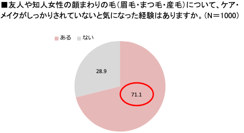 一方、「友人や知人女性の顔まわりの毛(眉毛・まつ毛・産毛)について、ケア・ メイクがしっかりされていないと気になった経験」についての質問では、7割以上の人が「気になった経験がある」と回答しました。自分ではケア・メイクをしっかりしているつもりでも、相手から見ると実はケア・メイク不足と思われている可能性があるといえます。