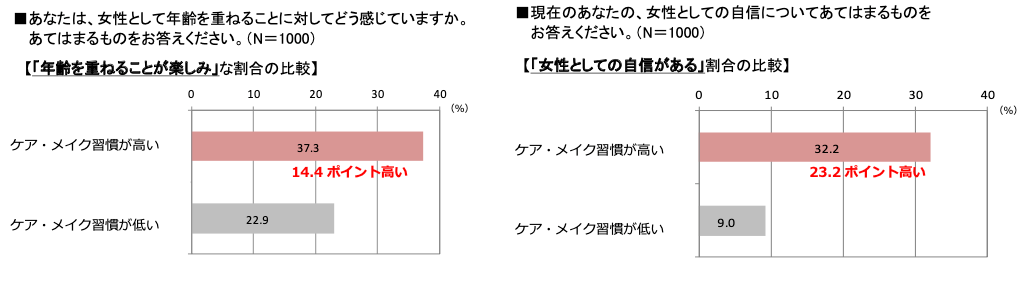 「女性として年齢を重ねることに対してどう感じているか」という質問では、「ケア・メイク習慣が高い」と回答した人のほうが「年齢を重ねることが楽しみ」と考えている割合が多いという結果。「女性としての自信がある」という人の割合も同様に、「ケア・メイク習慣が高い」と回答した人に多い傾向が見られました。