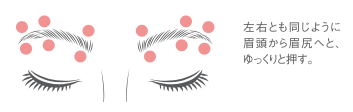 眉周りをマッサージすれば、目のむくみ・たるみの緩和や、目周り・眉全体をリフトアップした印象にする効果が期待できます。眉頭・眉山・眉尻の上下を、心地よさを感じる程度の強さでプッシュしてください。左右の眉毛で同じように、眉頭から眉尻へとゆっくり押しましょう。