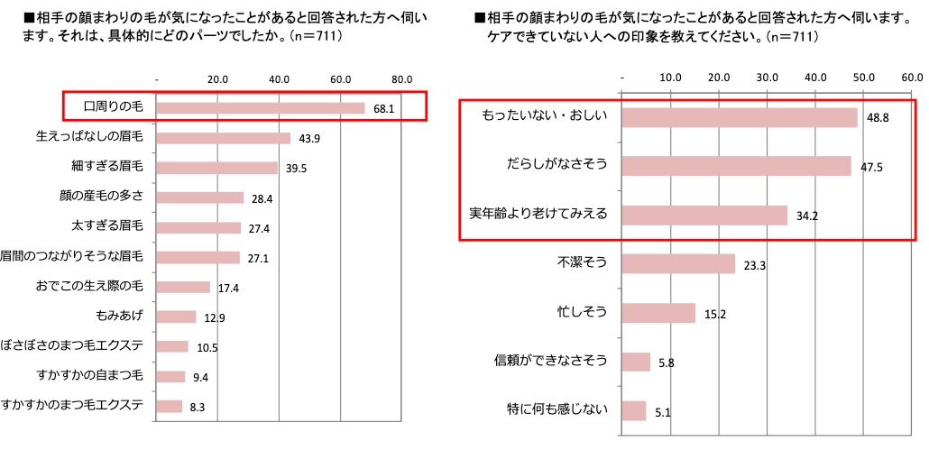 「顔まわりの毛が気になった具体的なパーツ」に関しては、「口周りの毛」「生えっぱなしの眉毛」「細すぎる眉毛」が多い傾向です。また、「ケアできていない人への印象」については、「もったいない・おしい」「だらしがなさそう」「実年齢よりも老けて見える」といった回答が多く見られました。このことから、少しの顔まわりの毛のケア不足で、自身の魅力が半減している可能性があるといえるでしょう。