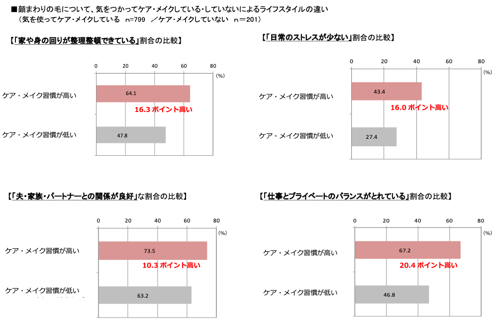 さらに、「家や身の回りが整理整頓できている」「日常のストレスが少ない」「夫・家族・パートナーとの関係が良好」「仕事とプライベートのバランスがとれている」と考えている人も、「ケア・メイク習慣が高い」という人に多い傾向です。