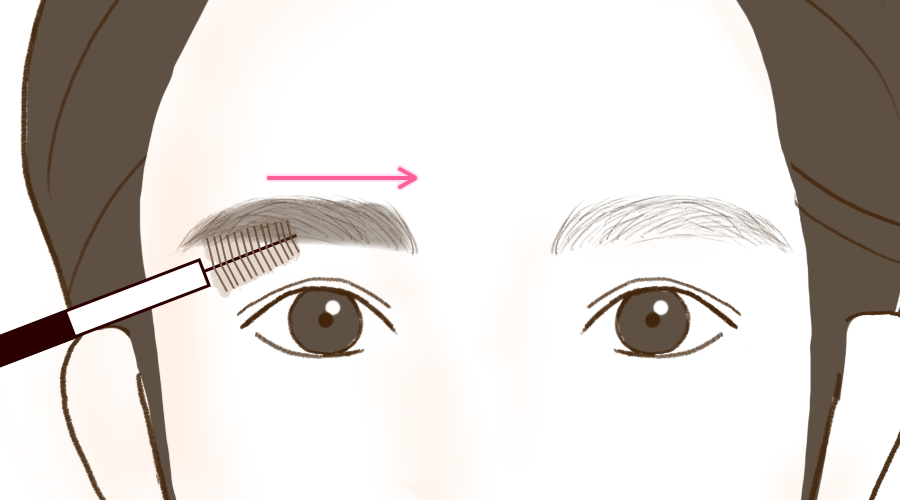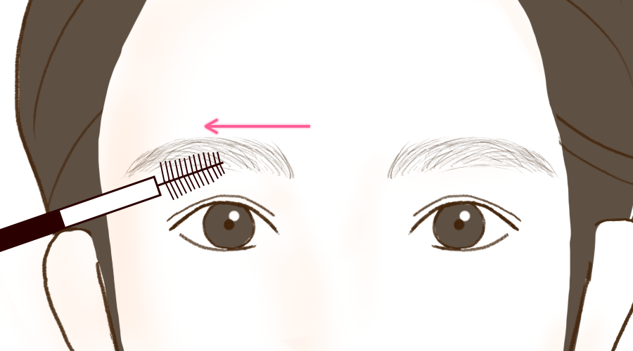 次に、眉をスクリューブラシでブラッシングしましょう。眉にブラシを当てて、毛流れに沿って横に流していきましょう。