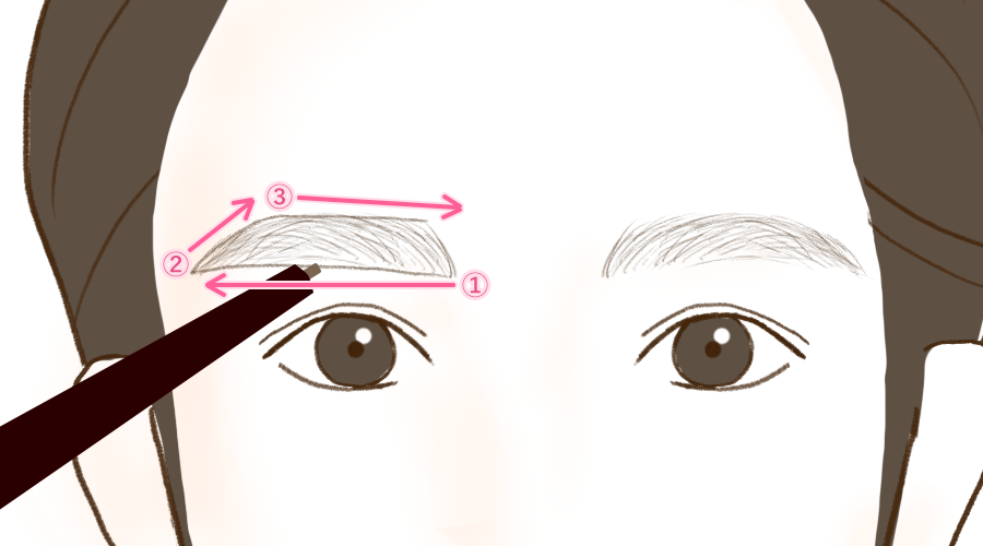 このとき、アイブロウペンシルは真ん中より後ろ側を持ち、力まずに使うのがポイントです。指に力を入れるのではなく、手首を軸にしてペンを動かしましょう。