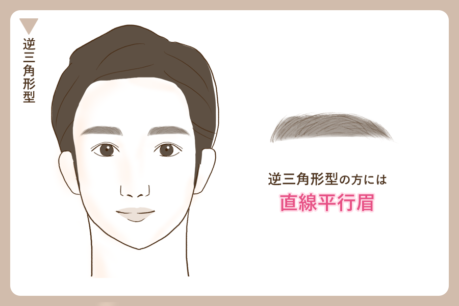 逆三角形の顔の男性には、長めの直線平行眉がぴったりです。眉山から眉尻の部分だけゆるやかなカーブを意識すれば、顔の輪郭とのバランスが取れてやさしい印象に仕上がります。