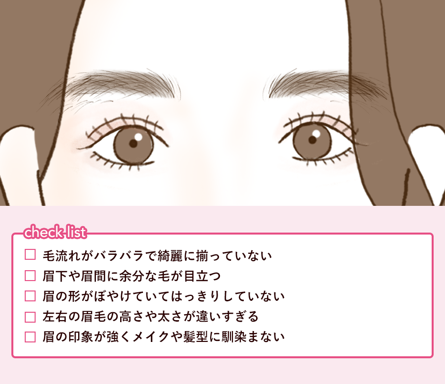 以下の表は、自眉がボサボサ眉毛になっていないか確認するためのチェックリストです。どれかに当てはまると、ボサボサ眉毛に見えてしまっているかもしれません。