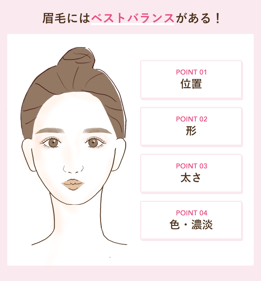 きれいな眉毛に整えるためのベストバランスは、眉の位置・形・太さ・色・濃淡のそれぞれで説明できます。各ポイントを押さえておきましょう。