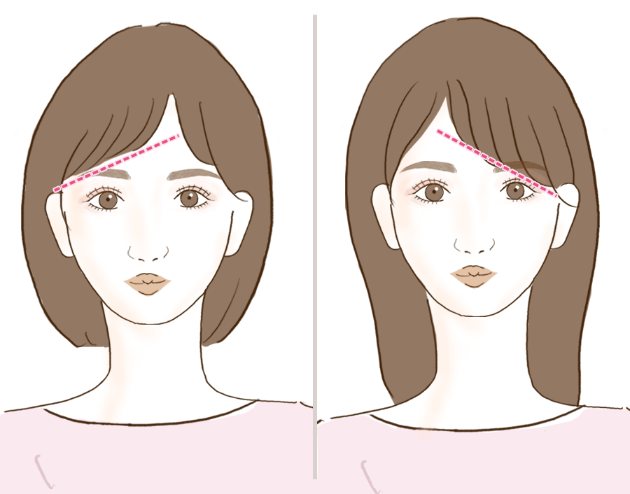 セルフケアのしすぎなどで、どうしてもすぐにすっぴん眉を左右対称に近づけるのが難しい場合には、前髪を工夫して眉毛の左右非対称感を軽くする方法もあります。たとえば、前髪も左右非対称のオン眉アシメにしてみたり、左右のどちらかに流すようにしてみると、眉毛の左右非対称感が薄れますよ。