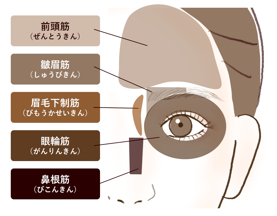 眉毛の生え方に影響する5つの筋肉とは、前頭筋・皺眉筋・眉毛下制筋・鼻根筋・眼輪筋です。表情に連動して各筋肉が動き、それに合わせて眉毛も動きます。