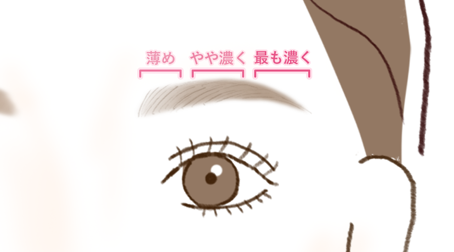 眉毛の濃淡にはベストなバランスがあります。眉頭を薄め・黒目の真上をやや濃く・眉尻を最も濃くするように整えるのがポイントです。すっぴん眉の濃淡だけでなく、アイブロウパウダーをのせるときにも同様の濃淡のバランスを意識しましょう。