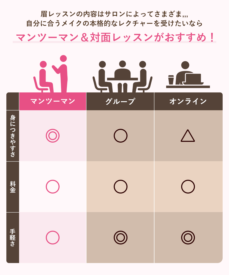 なお、レッスンの形式には、マンツーマンとグループレッスンがあります。マンツーマンの方が、自分だけの眉のメイクアップ方法を身につけやすいでしょう。一方、いきなりマンツーマンは不安という場合は、比較的気軽に参加しやすいグループレッスンに挑戦するのも選択肢のひとつです。