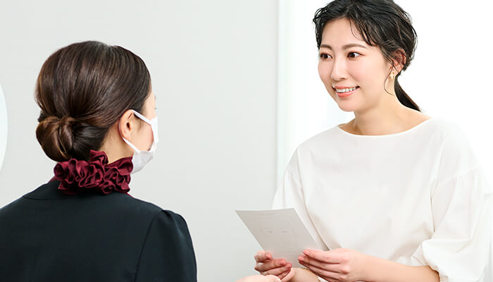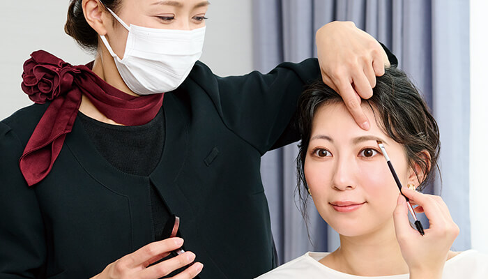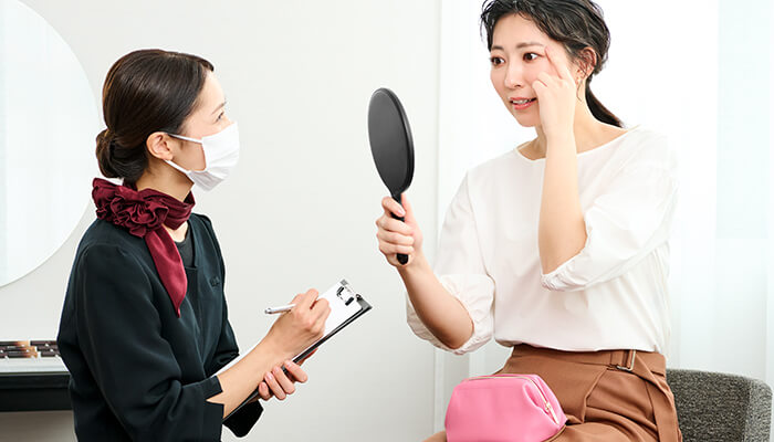 まずは、普段のメイクアップ方法やメイク道具についてヒアリングを行います。当日は、普段どおりのメイクアップでお越しください。メイクアップ中に難しいと感じるポイントや、目指しているメイクアップのイメージなどがあれば、ここでうかがいます。